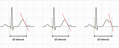 QT interval je faza EKG-a koja prikazuje vrijeme od početka QRS kompleksa do kraja T vala i predstavlja ventrikulsku depolarizaciju i repolarizaciju. QT interval bi se trebao mjeriti ručno, u odvodu 12-kanalnog EKG-a koji najbolje prikazuje kraj T vala (najčešće II, V5 ili V6), od početka QRS kompleksa pa do kraja T vala. Manji U-valovi (<0,1 mV) trebaju biti isključeni iz mjerenja, dok se veći U-valovi, koji se stapaju s T- valovima, uključuju u mjerenje. Trebala bi se izračunati prosječna vrijednost QT intervala u 3-5 srčanih ciklusa. Kraj T-vala određuje se točkom sjecišta između linije nacrtane na maksimalnom padu T-vala i izoelektrične linije. Na kraju, QT interval trebao bi biti prilagođen frekvenciji pulsa 60/min da bi se dobio korigirani QT interval (QTc) [9].