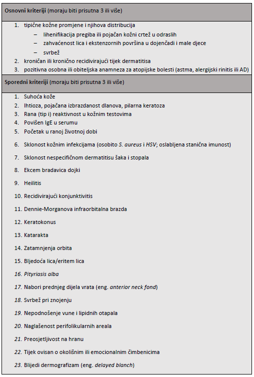 - Dijagnoza AD-a se postavlja na temelju anamneze i kliničke slike, a prema standardiziranim kriterijima za postavljanje dijagnoze AD-a. Najčešće korišteni kriteriji su Hanifin i Rajka kriteriji, Millenium kriteriji i kriteriji Američke akademije za dermatologiju.