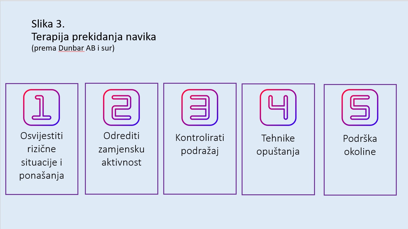 • Tehnika prekidanja navike (habitual reversal training, HRT) uvježbava nepoželjna ponašanja (na primjer, čupkanje kose, svrbež) zamijeniti poželjnim. Uvježbava se kroz nekoliko faza. U prvoj fazi osoba mora osvijestiti situacije kada se ponašanje javlja. Osoba vodi dnevnik ponašanja prema danima, a savjetuje se istovremeno zapisivati misli i emocije koje se u tim situacijama javljaju. U drugoj fazi potrebno je razviti drugo ponašanje, odnosno „ruke zaposliti na drugi način“. Primjerice, umjesto da se češem, stiskam gumenu lopticu, gladim kožu ili slično. Treća faza se obično odrađuje zajedno s prve dvije, a to je razvijanje dodatne kontrole, na primjer, nositi duge rukave ili nositi svilene rukavice da se smanji grebanje kože. Četvrta faza uključuje uvježbavanje tehnika relaksacije, dok peta faza uključuje podršku okoline. Treća, četvrta i peta faza uvježbavaju se od početka terapijske tehnike.