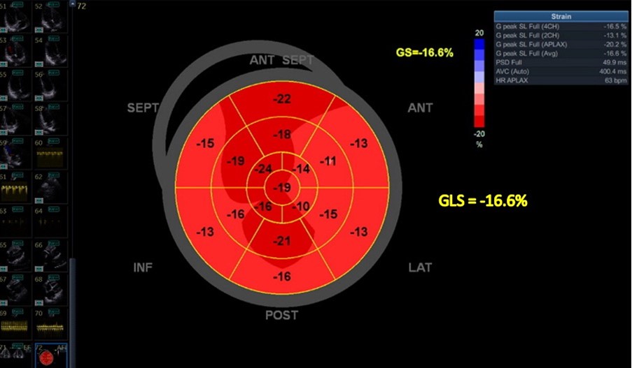 Globalni longitudinalni strain (GLS) ili naprezanje je mjera deformacije miokarda koja odražava uglavnom uzdužnu odnosno longitudinalnu kontrakciju lijeve klijetke tijekom sistole. Koristan je parametar za procjenu ranih promjena u funkciji miokarda i prije nego što promjene u ejekcijskoj frakciji (EF) postanu vidljive. Softver za praćenje prirodnih akustičnih markera (točkica) unutar tkiva miokarda u 2D tehnici, kadar po kadar tijekom srčanog ciklusa izračunava količinu deformacije miokarda, posebno uzdužnog naprezanja, pa se GLS predstavlja kao negativna vrijednost (jer se vlakna miokarda skraćuju tijekom sistole). Normalna GLS vrijednost lijeve klijetke obično je oko -20% do -22% za zdrave osobe. Klinički značaj GLS-a te poboljšani GLS klinički je značajan jer korelira s ukupnim performansama miokarda i predviđa ishode kod pacijenata sa zatajivanjem srca različitih etiologija, stoga su brojna ispitivanja pratila učinak eplerenona na miokard i GLS-om. Naime, primarni mehanizam djelovanja eplerenona povezan je s blokiranjem mineralokortikoidnih receptora i smanjenjem učinaka aldosterona koji doprinosi fibrozi miokarda, hipertrofiji i remodeliranju, te se ti pozitivni učinci mogu pretvoriti u bolju funkciju miokarda, što se odražava u poboljšanju vrijednosti GLS-a. Djelovanjem eplerenona na smanjenje predopterećenja i naknadnog opterećenja (preload, afterload) može se neizravno poboljšati sposobnost srca da stvara bolju kontrakciju i udarni volumen. U bolesnika sa zatajivanjem srca (osobito sa smanjenom ejekcijskom frakcijom-HFrEF), pokazalo se da eplerenon poboljšava vrijednosti GLS-a, što sugerira poboljšanu funkciju miokarda i smanjenje disfunkcije miokarda. Čak i kod pacijenata s relativno očuvanom ejekcijskom frakcijom, poboljšanje GLS-a nakon terapije eplerenonom moglo bi ukazivati na rano pozitivno remodeliranje miokarda, što je ključno jer GLS može identificirati disfunkciju ranije od LVEF-a koja može ostati normalna do kasnije progresije bolesti, odnosno detektirati subkliničku disfunkciju miokarda. Također treba dodati da eplerenon nije pokazao u ispitivanjima poboljšanje u preživljenju bolesnika sa srčanim zatajivanjem i očuvanom istisnom frakcijom lijeve klijetke (HFpEF) (1,2).