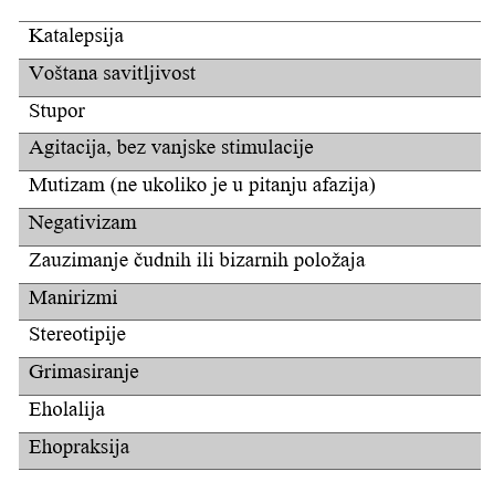 Sami kriteriji za katatoniju su u biti ostali isti onima u DSM-IV, no sada su razdvojeni u dvanaest specifičnih entiteta od kojih istodobna prisutnost barem tri zadovoljava uvjete za dijagnosticiranje katatonije (Tablica 1.) [3].