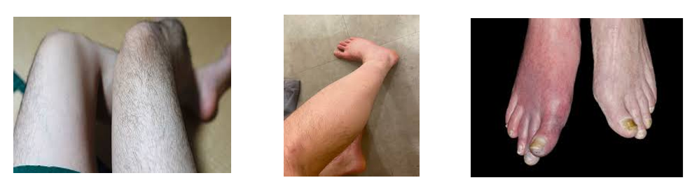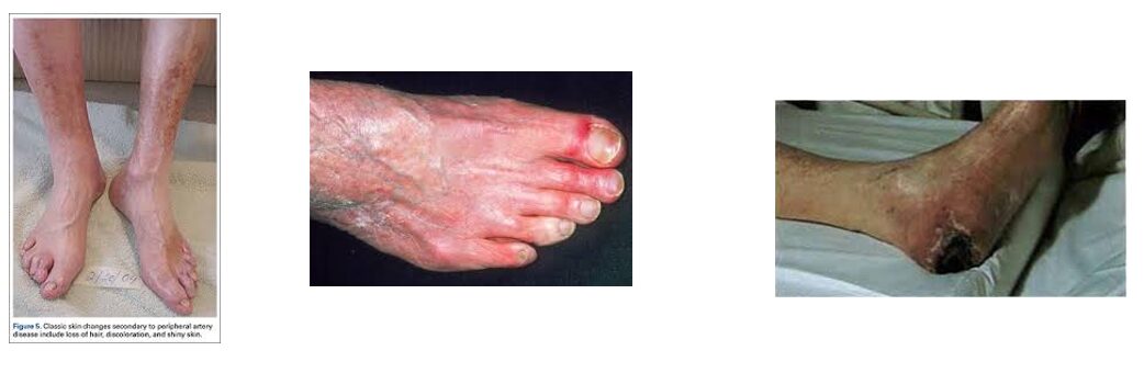 – slabiji rast dlaka na nogama, slabiji rast noktiju, slabost mišića, redukcija potkožnog masnog tkiva na listovima, promjene senzibiliteta na nogama, promjena boje kože, pojava ranica