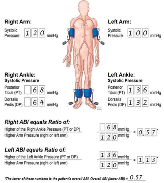 – arterije kod starijih ljudi, bolesnika s dijabetesom ili bubrežnom bolesti mogu biti jako kalcificirane, time i manje kompresibilne, što vodi do lažno visokih vrijednosti ABI (>1,4)
