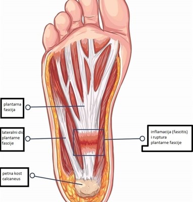 Najčešći uzrok boli u plantarnoj regiji stopala je plantarni fascitis (3). Mjesto najčešće boli obično je u blizini polazišta plantarne fascije na medijalnom dijelu kalkaneusa. Plantarni fascitis svrstavamo u sindrome prenaprezanja zbog etiologije nastanka. Javlja se zbog degenerativnih promjena nastalih zbog dugotrajnih ponavljajućih opterećenja – mikrotrauma.