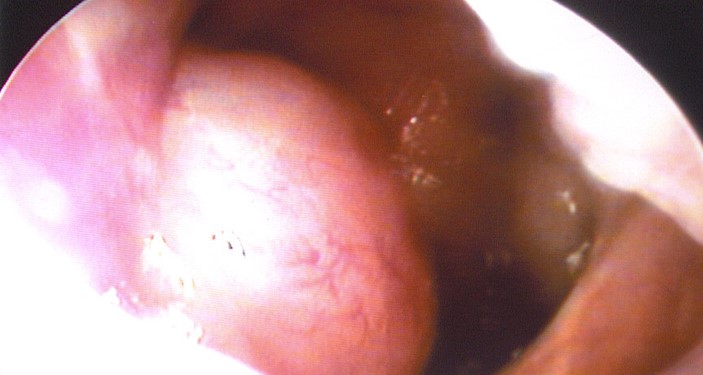 Polipi nosa predstavljaju reakciju sluznice na različite uzročnike pri čemu se kao najčešći uzrok nastajanja polipa nosa smatra alergija. Klinički se radi o blijedim, poluprozirnim, tvorbama nalik „oguljenom zrnu grožđa“ (Slika 1), koje polaze najčešće sa sluznice u predjelu srednje nosne školjke, dok su iznimno rijetki oni koji polaze sa sluznice nosne pregrade ili donje nosne školjke.2-3