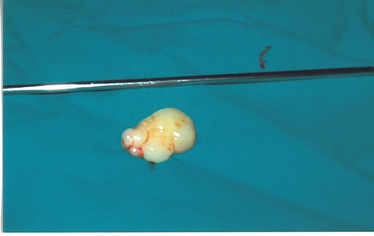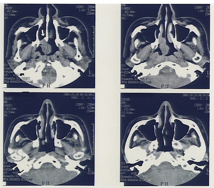 Pažljivim pregledom i palpacijom utvrđeno je ishodište polipoidne tvorbe na suprotnoj desnoj strani donjeg dijela nosne pregrade. Ovo je potvrđeno i CT snimkama paranazalnih šupljina na kojima je bila vidljiva polipoidna tvorba u području epifarinksa koja je bila usmjerena prema desnom nosnom hodniku promjera oko 20mm (Slika 3). Prijeoperacijska biopsija ukazala je da se radi o polipu. U endotrahealnoj anesteziji pod kontrolom endoskopa učinjena je ablacija polipa veličine 27x20mm (Slika 4). Patohistološka dijagnoza bila je: Inflammatio chronica polyposa. Kašalj kao simptom koji je pacijenticu doveo na pregled nestao je nakon operacije.